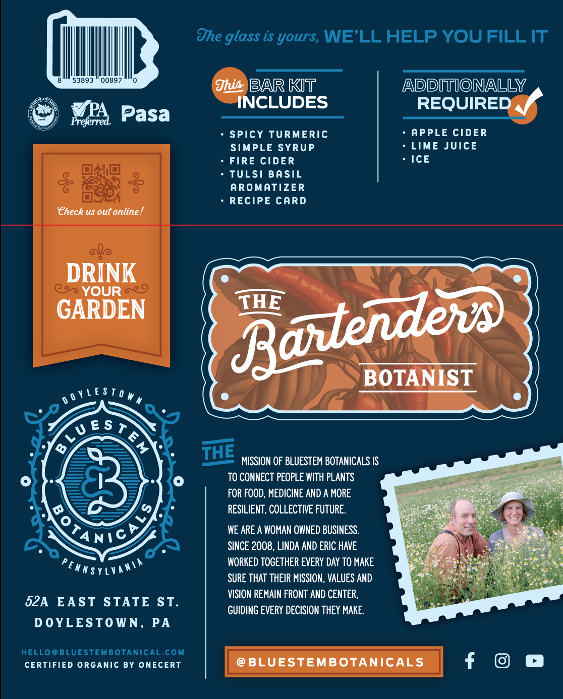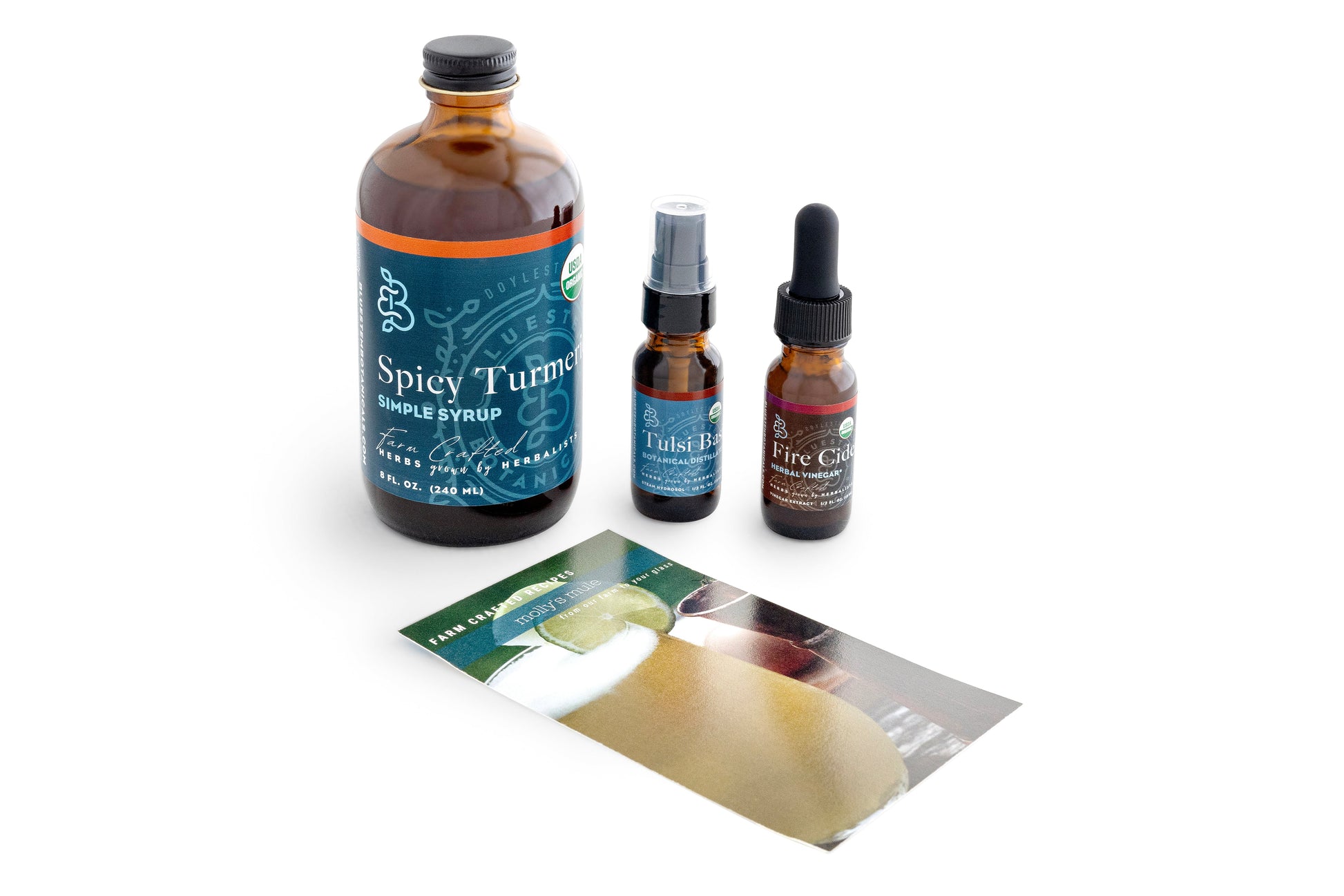 Molly's Mule includes: Spicy Turmeric Simple Syrup + Fire Cider +Tulsi Basil Aromatizer. These botanical extracts are paired perfectly with Apple Cider & Lime Juice for a complex and aromatic alcohol-free cocktail.