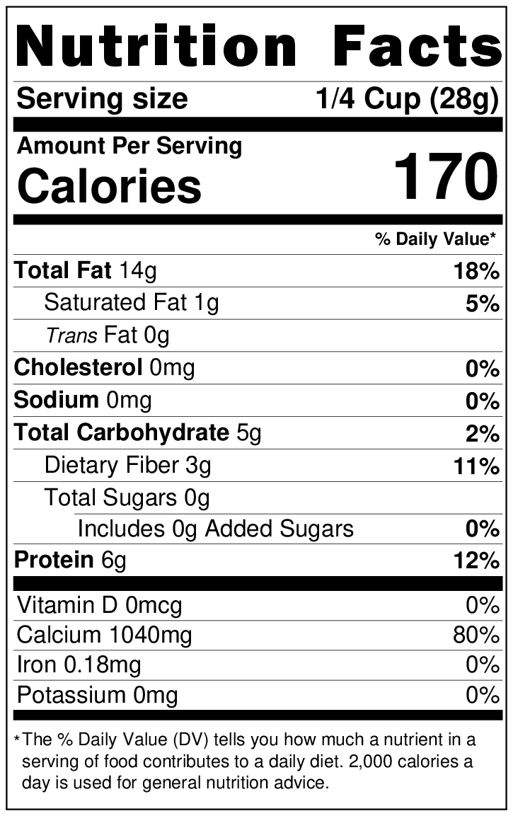 Product packed in a facility that also handles nuts, peanuts, soy, sesame, and wheat. 12 oz and 5 lb sizes only.