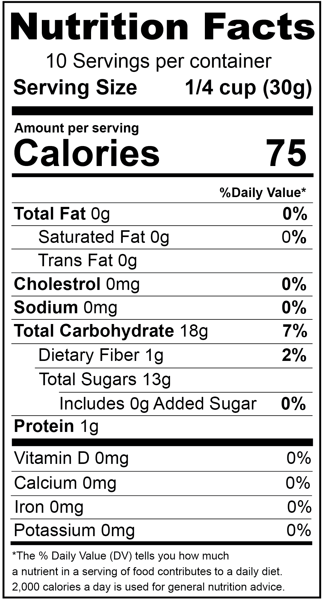 Allergen Statement: Product packed in a facility that also handles nuts, peanuts, soy, sesame, and wheat. 1 lb and 5 lb sizes only.
