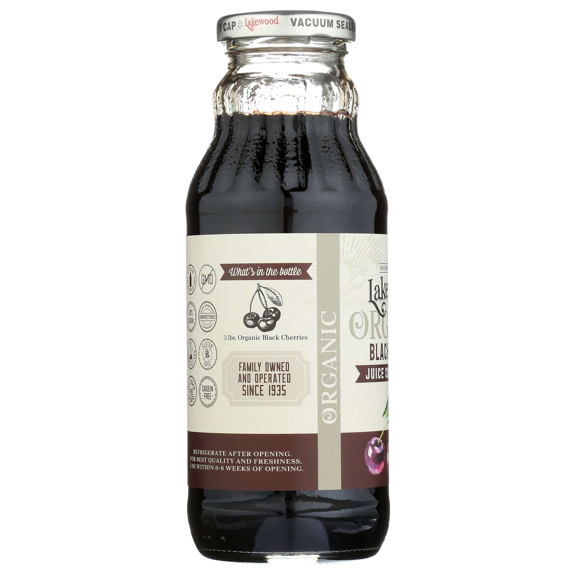 With the juice of over 4 lbs of cherries in every bottle, Lakewood's delicious cherry juice harnesses some of nature's best flavors to give you this absolutely pure cherry juice! With no added sugar or additives, this 100% fresh pressed cherry juice just contains cherry juice and all vitamins that come with natural, whole, ripe, organic cherries.