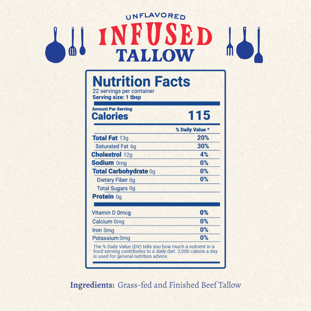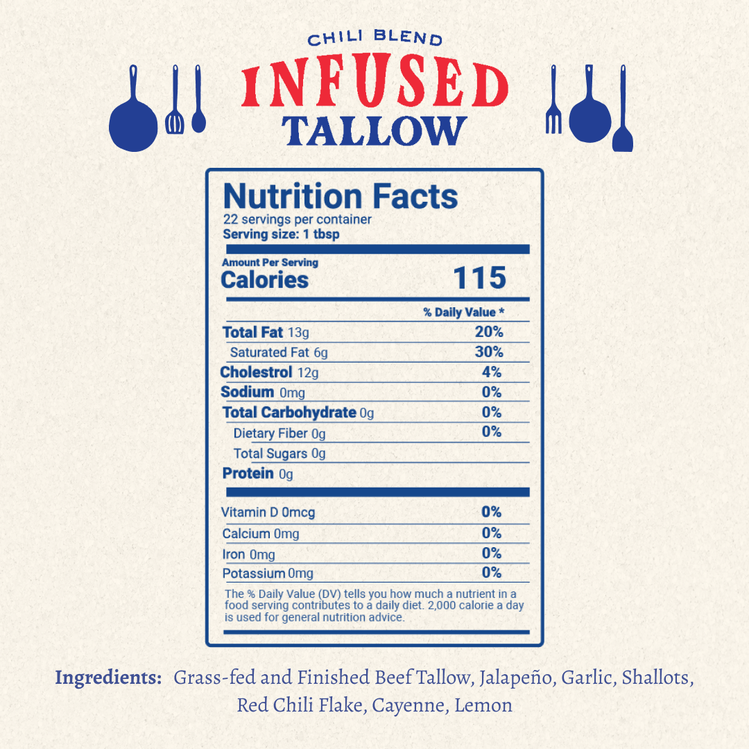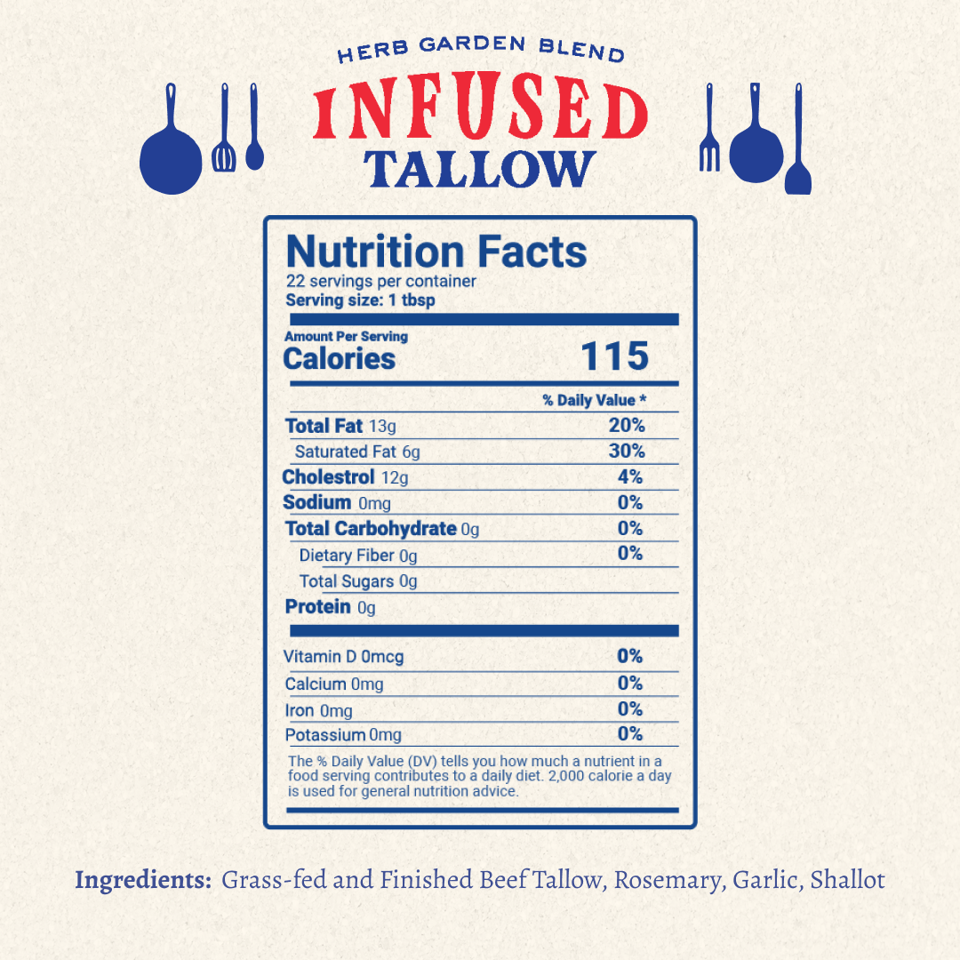 Cooking tallow, the old-school way. We start with grass-fed beef fat and infuse it slow—with real ingredients you can see, smell, and taste. No seed oils. No junk. Just rich, savory flavor built for cast iron, sheet pans, and every recipe in between. Simple. Flavorful. Honest. Made in the USA.