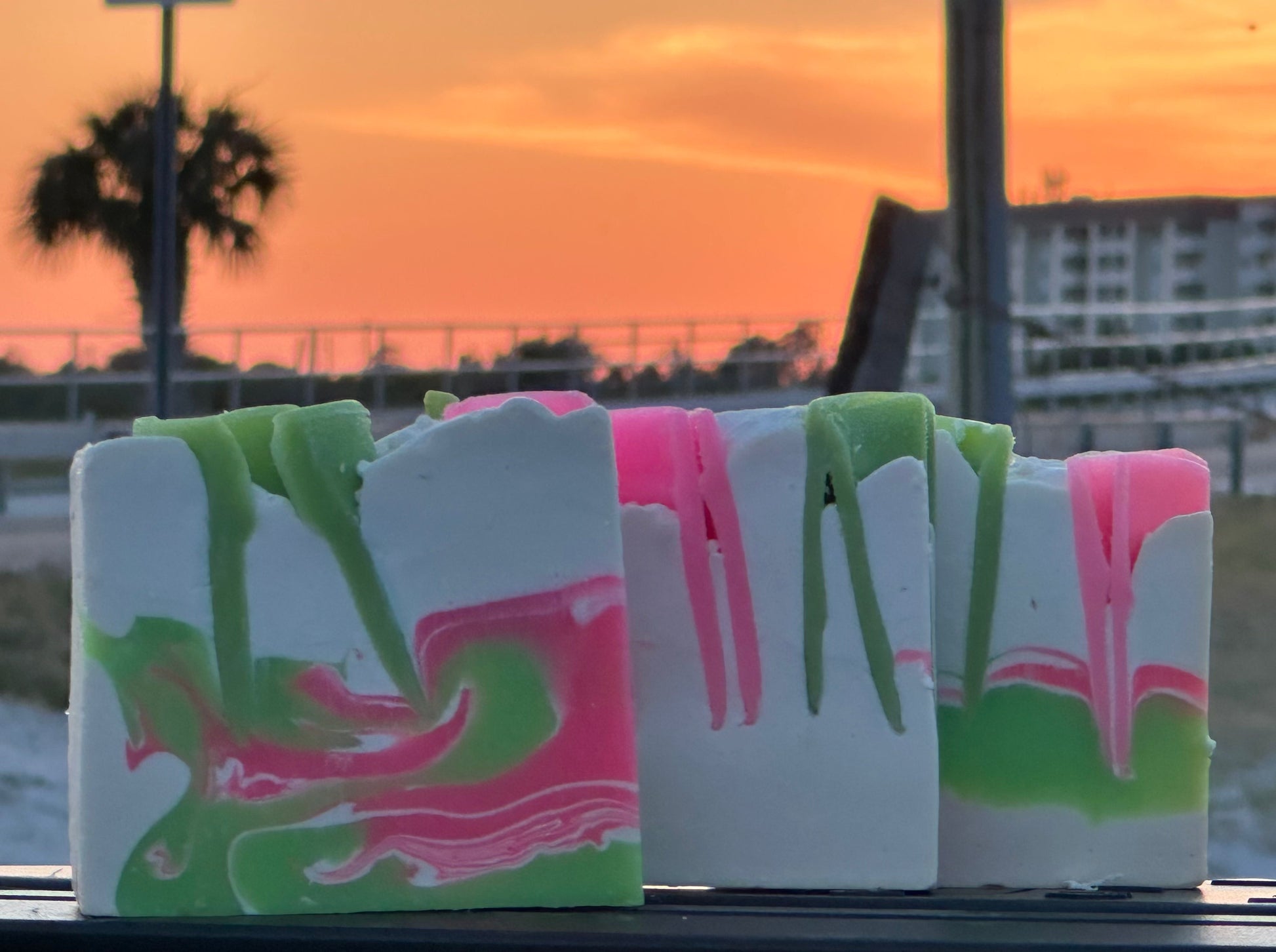 Purified water, saponified oils of organic olive, organic coconut, palm, shea butter, select essential and/or fragrance oils, sugar pearls.