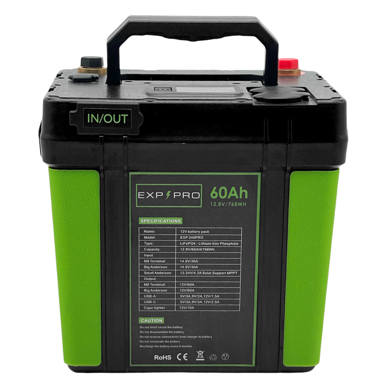 The device also includes a 12V 60A M8 terminal and integrated USB ports for additional power needs. An LED display indicates voltage and amperage in real-time, while the inclusion of a 14.6V 10A power charger offers lightning-fast 6-hour recharging capabilities. With an IP65 waterproof rating and a 5-year warranty, this battery is a reliable power source for a wide range of applications.