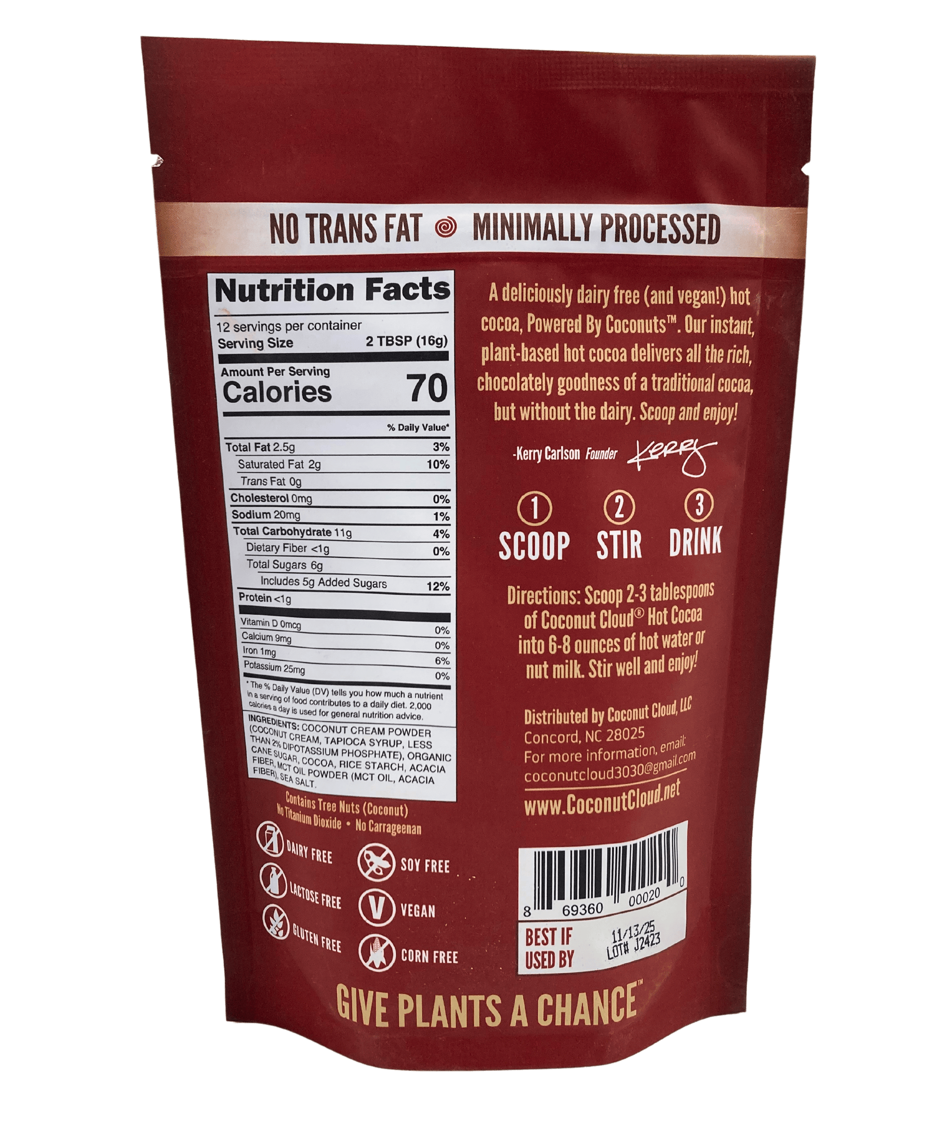 A deliciously dairy-free and vegan hot cocoa, powered by coconuts. This plant-based hot cocoa delivers all the rich chocolatey goodness, but without the dairy. Scoop and enjoy!