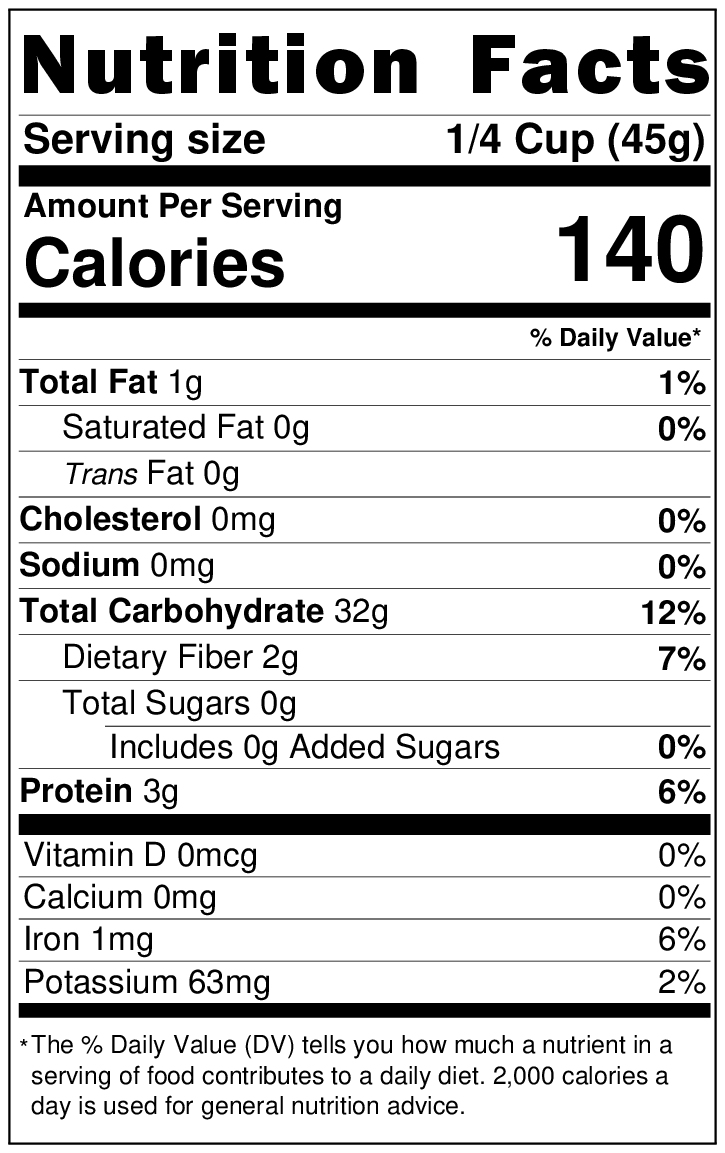 Instructions: Rinse rice thoroughly with cool water. Combine 2 cups of water with 1 cup of rice. If desired, add salt or olive oil. Bring to a boil. Reduce heat to low simmer, then cover. Leave covered and simmer for 45 minutes. At the end of the cook time, check if rice is chewy and tender, and no longer crunchy. If it is still crunchy, add a little more water if needed and continue cooking. Check every 10 minutes until the rice is done. Once done, remove rice from heat and let stand for 10 to 15 minutes. Fluff with fork before serving.