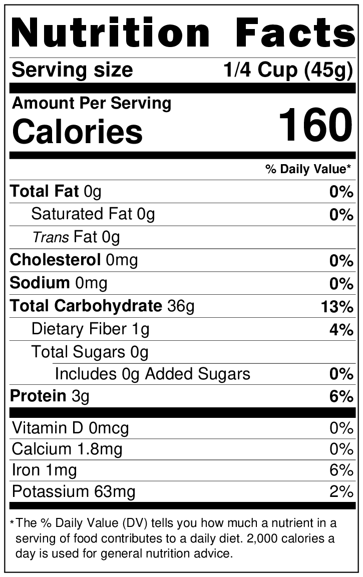 Instructions: Rinse rice thoroughly with cool water. Combine 2 cups of water with 1 cup of rice. If desired, add salt or olive oil. Bring to a boil. Reduce heat to low simmer, then cover. Leave covered and simmer for 20-30 minutes. At the end of the cook time, check if rice is chewy and tender, and no longer crunchy. If it is still crunchy, add a little more water if needed and continue cooking. Check every 10 minutes until the rice is done. Once done, remove rice from heat and let stand for 10 to 15 minutes. Fluff with fork before serving.