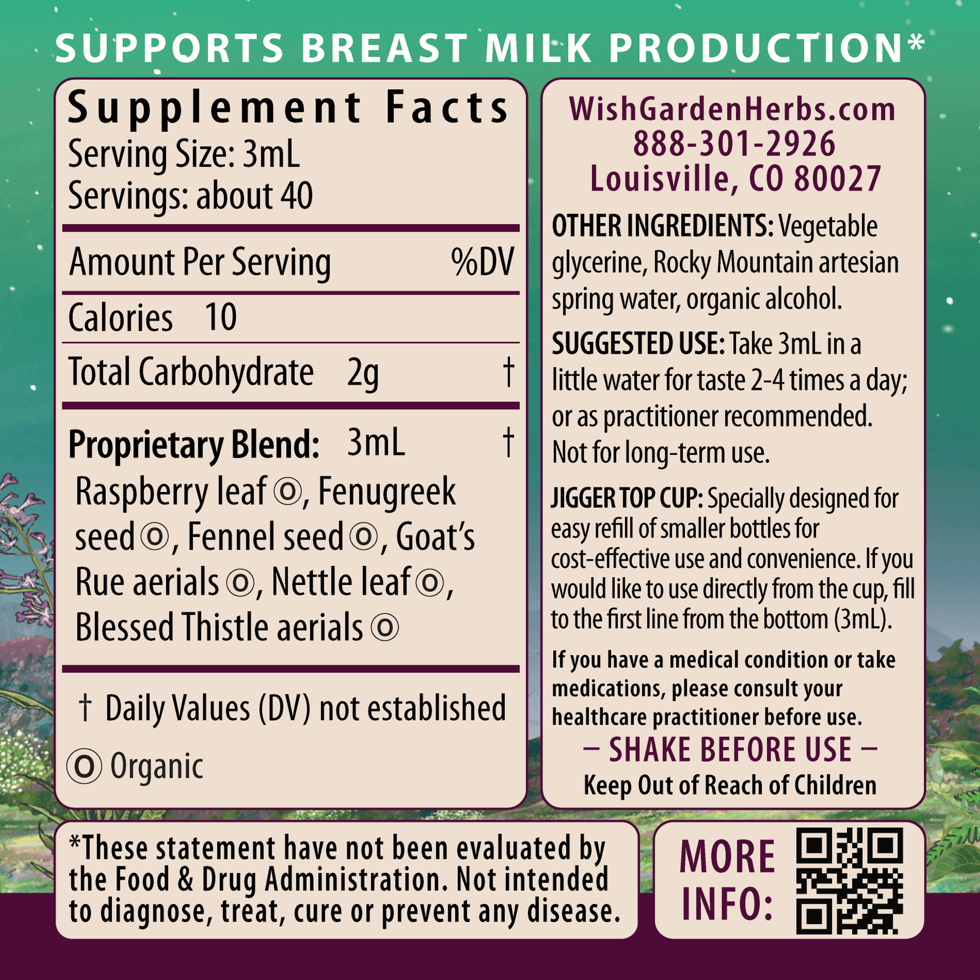 Organic Raspberry leaf (Rubus idaeus), organic Fenugreek seed (Trigonella foenum-graecum), organic Fennel seed (Foeniculum vulgare), organic Goat’s Rue aerials (Galega officinalis), organic Nettle leaf (Urtica dioica), organic Blessed Thistle aerials (Cnicus benedictus), vegetable glycerine, Rocky Mountain artesian spring water & organic gluten-free alcohol.