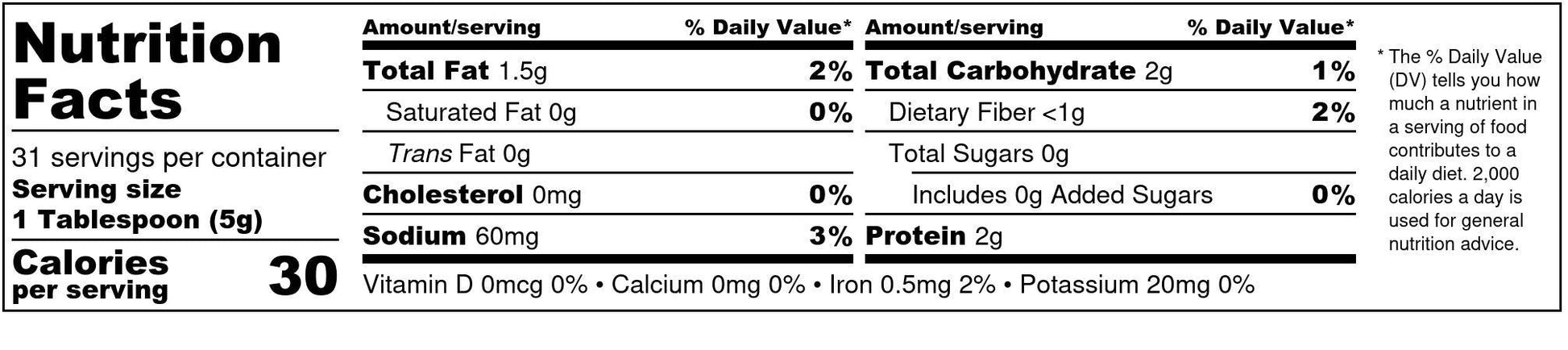 Cashew Flour*, Nutritional Yeast*, Sea Salt, Granulated Garlic*, Lemon Juice Powder* *Organic