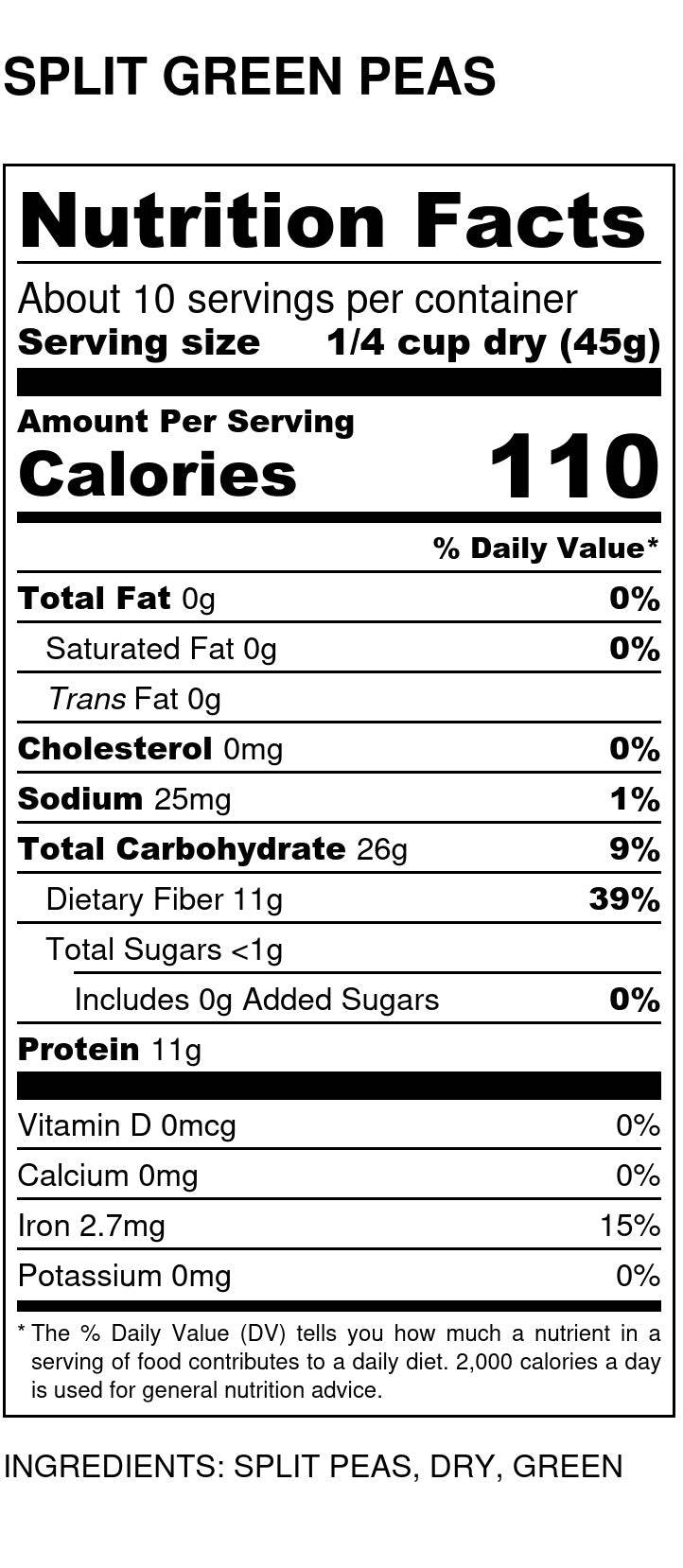 Green split peas are rich in plant-based protein, which is essential for building and repairing tissues in the body. They also contain iron, zinc, and phosphorus. A diet rich in split peas and other legumes may help reduce cholesterol, hypertension, and the risk of pre-diabetes, and may also offer significant anti-inflammatory effects.