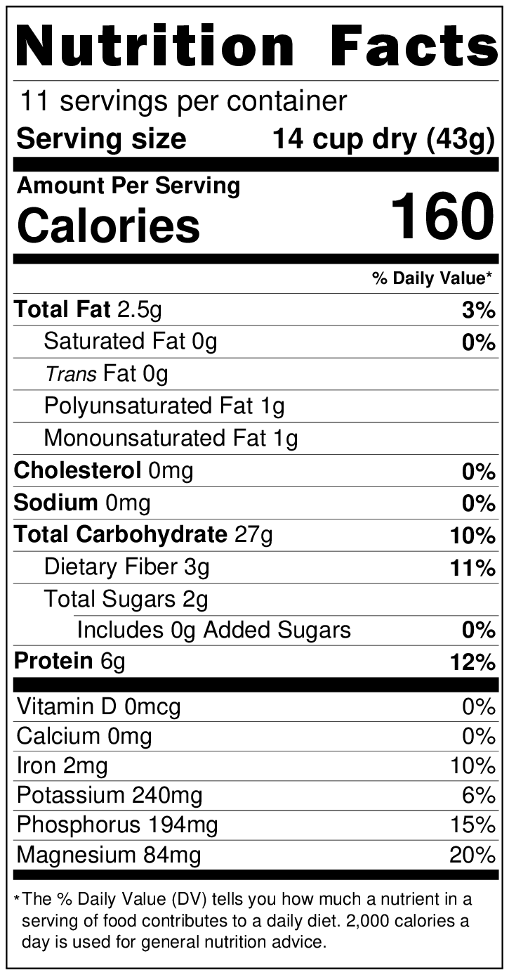 Allergen Statement: Product packed in a facility that also handles nuts, peanuts, soy, sesame, and wheat. 1 lb and 5 lb sizes only.