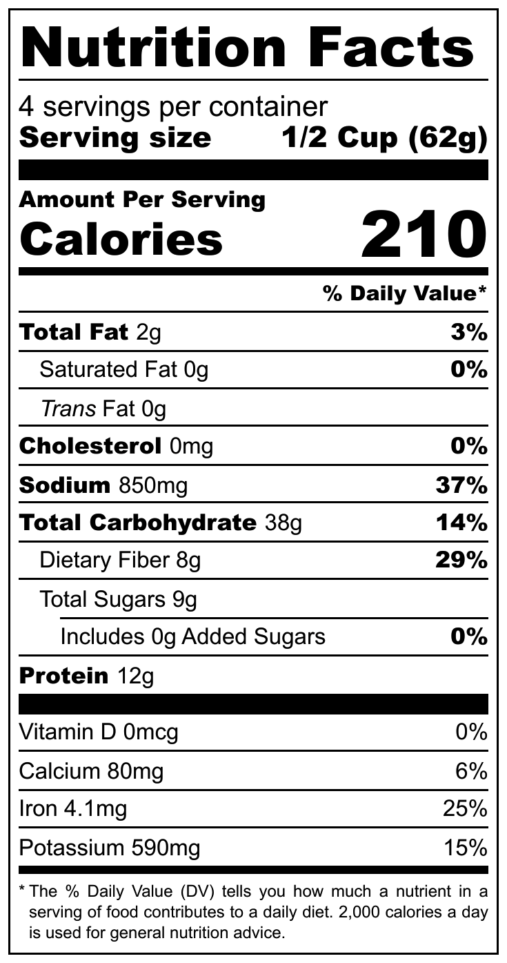 *Refried Black Beans, *Onion Flakes, *Celery Flakes, Green Bell Pepper Dices, Real Salt, *Granulated Garlic, *Cumin, *Lemon Juice Powder, *Bay Leaves